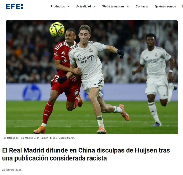 直播吧02月23日讯西班牙著名媒体《埃菲社》发文报道了赫伊森转发辱华内容的事件,谈到了赫伊森“微博特供”版致歉以及皇马在2024年就曾卷如果类似的争议,当时一位皇马球迷唱歧视性歌曲引发中国球迷不满。